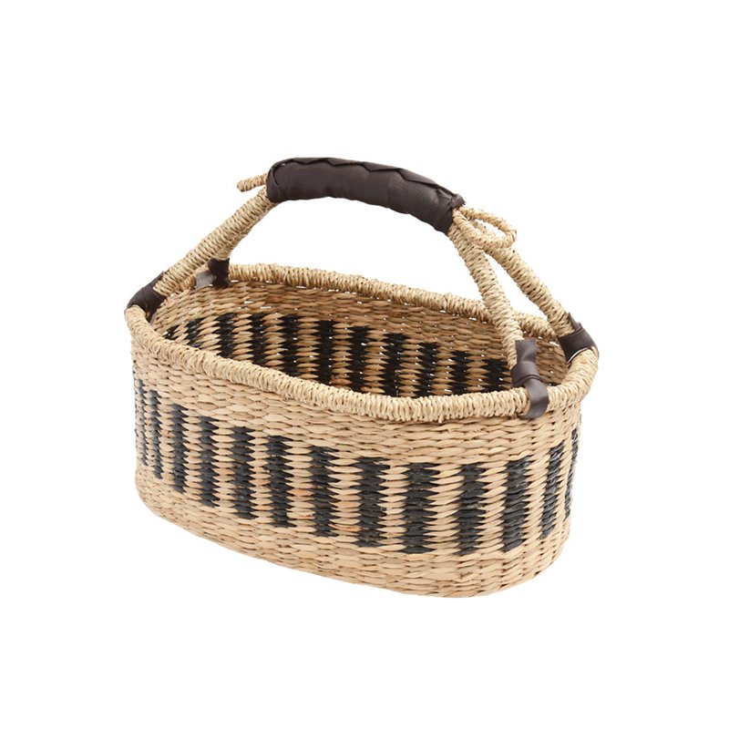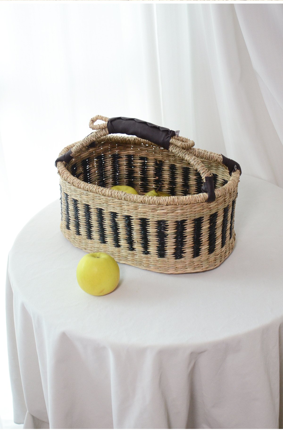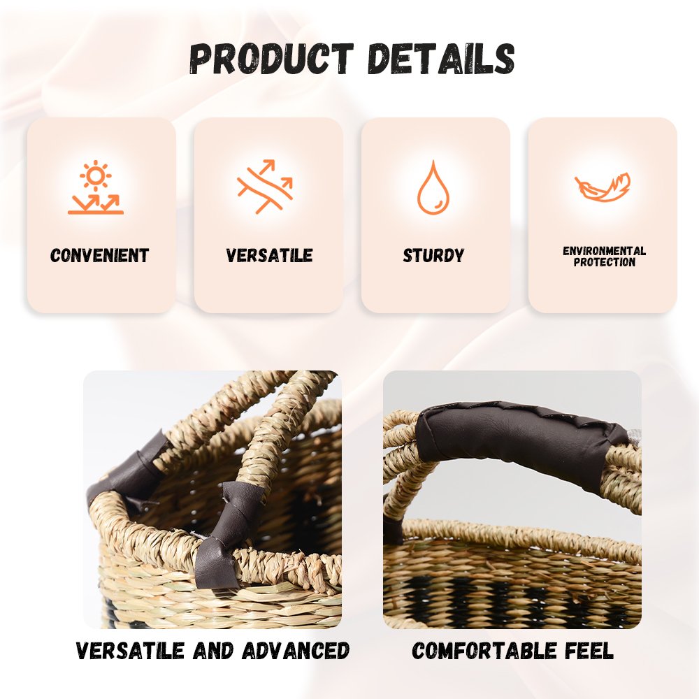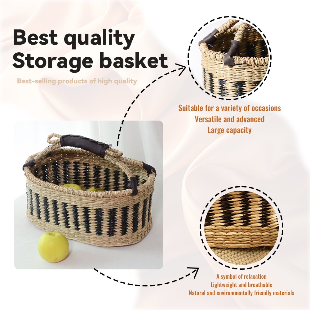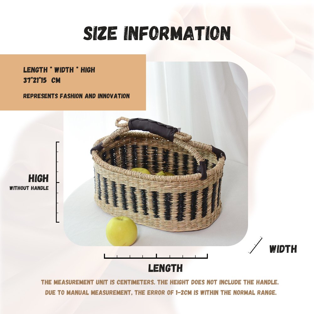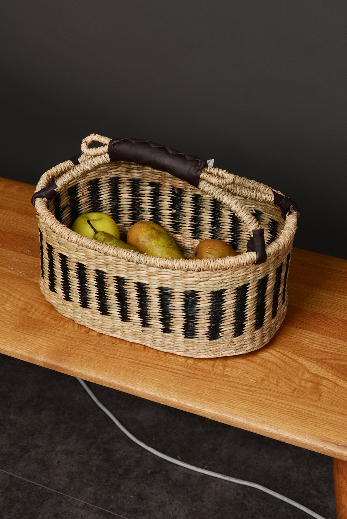 1. Hand – woven basket with contrasting stripe patterns and leather – like handles, perfect for storing fruits, snacks, or small household items, keeping them neatly arranged.