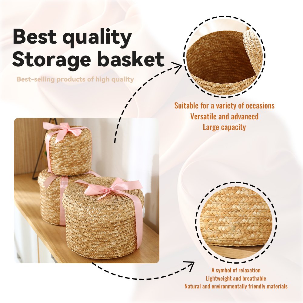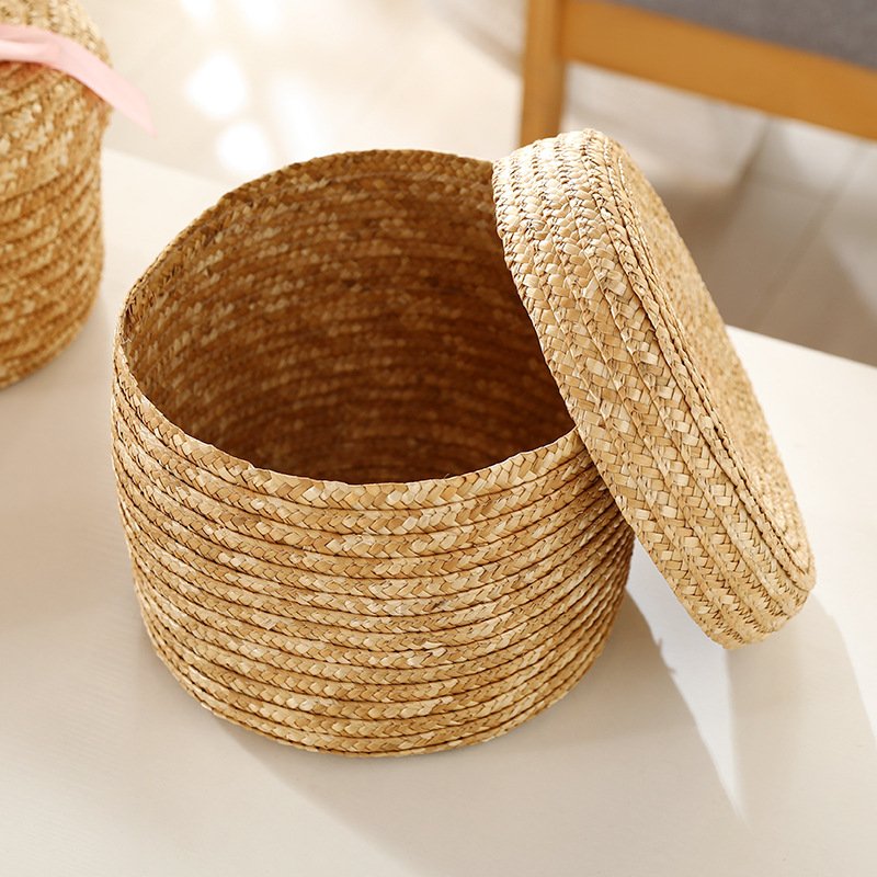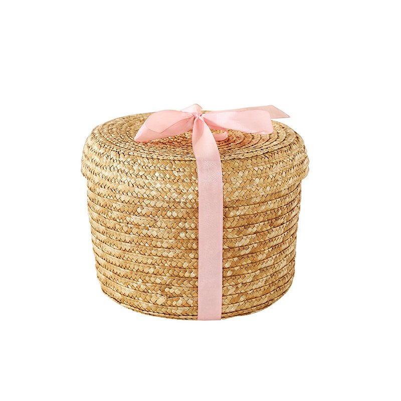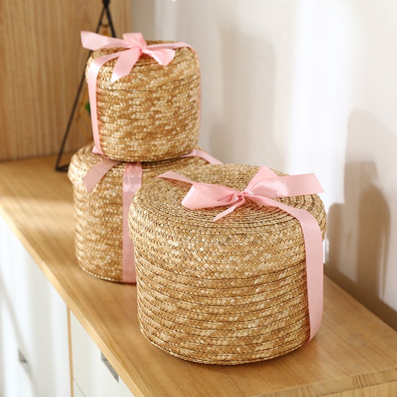 3. Crafted as a woven storage container with a lid and a decorative bow, it provides an elegant solution for storing small beauty products or hair accessories, blending functionality with a pretty aesthetic.