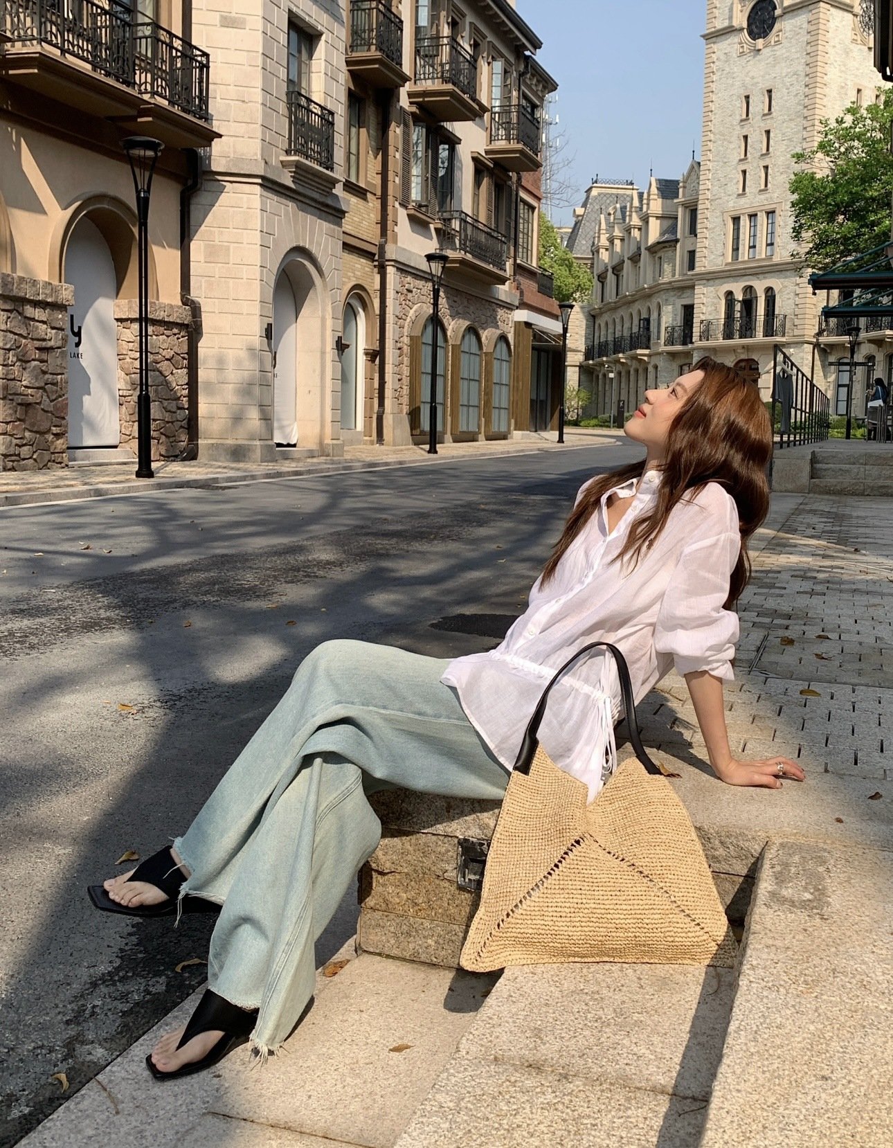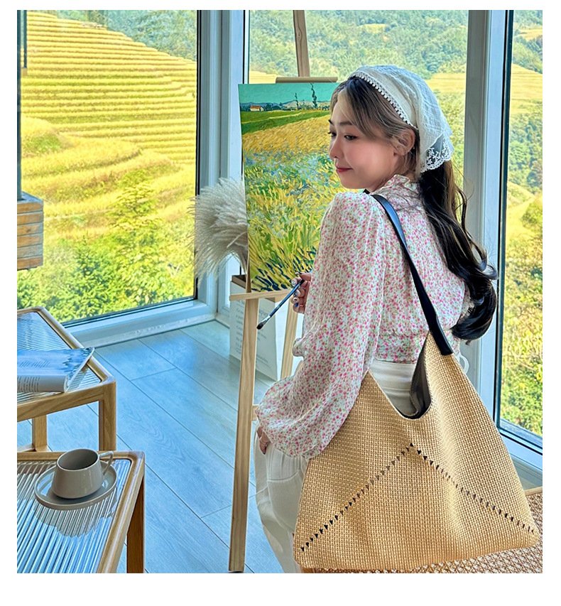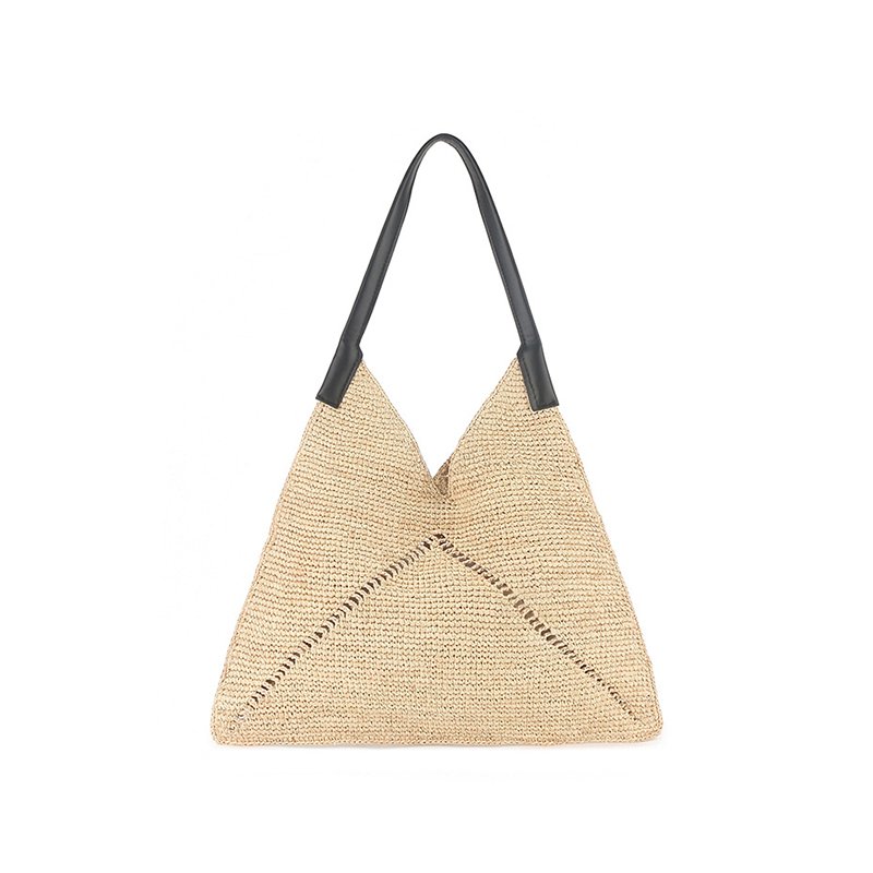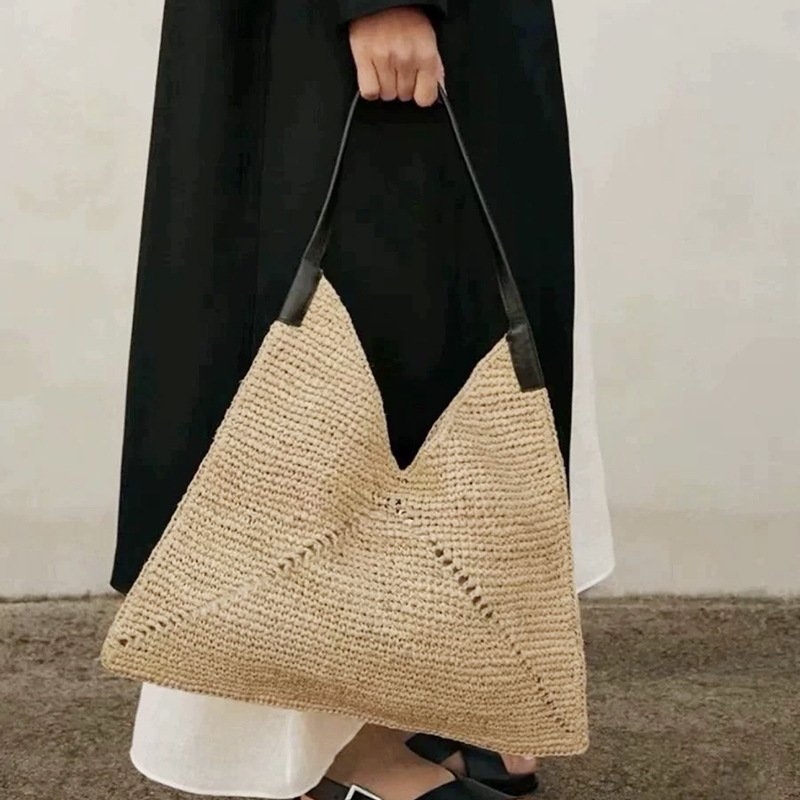 - Hand – woven raffia tote with a unique triangular silhouette and contrast – material handles, perfect for carrying daily essentials like a tablet, a notebook, and a water bottle, adding a modern, geometric touch to your look.
