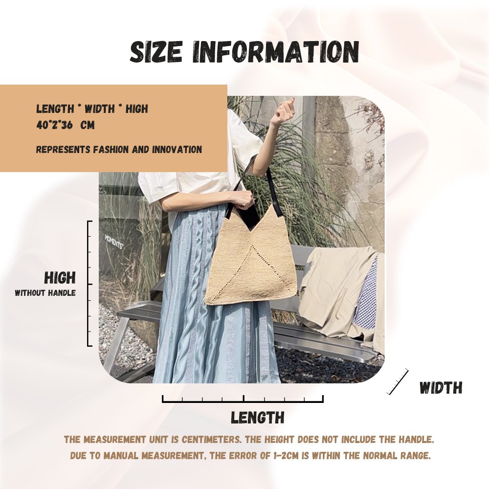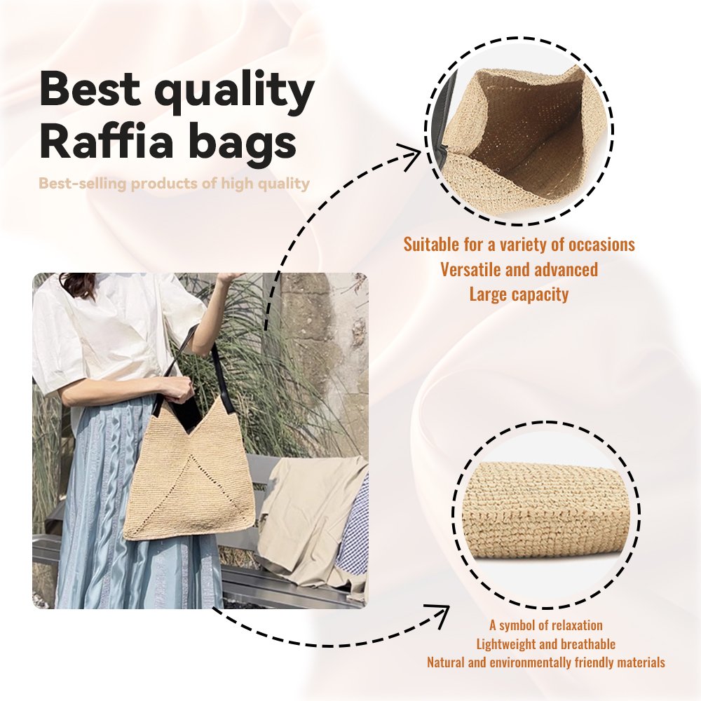 - Woven raffia handbag with a distinctive, triangular – shaped body and comfortable, contrasting handles, great for storing personal belongings like a phone, a compact mirror, and lip balm, making it a stylish choice for work or outings.